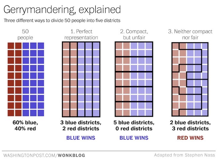 Prenez un Etat avec 5 districts alloués. Les élections précédentes, selon le découpage précédent, ont montré que 60% des électeurs votent bleu, 40% votent rouge. Dans une représentation parfaite (schéma N°2), les électeurs sont géographiquement répartis et l’Etat envoie 3 Représentants bleus et 2 rouges. Dans la vraie vie, des majorités se dessinent, par ville ou quartier. On peut alors ruser.