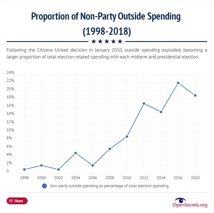 Tous ces éléments concourent à l’inflation des montants dépensés qui atteignent des records. Pour la bataille de 2018 pour le sénat de Floride, on a atteint le montant historique de 213M$, dont 97M$ dépensés indépendamment par les PACs et Super-PACs.